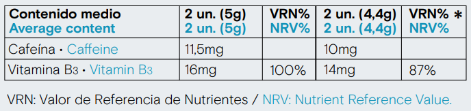 Enriquecido con vitamina B3 que ayuda a reducir el cansancio y la fatiga, y con cafeína de origen natural para darte ese empujón de energía cuando más lo necesitas.